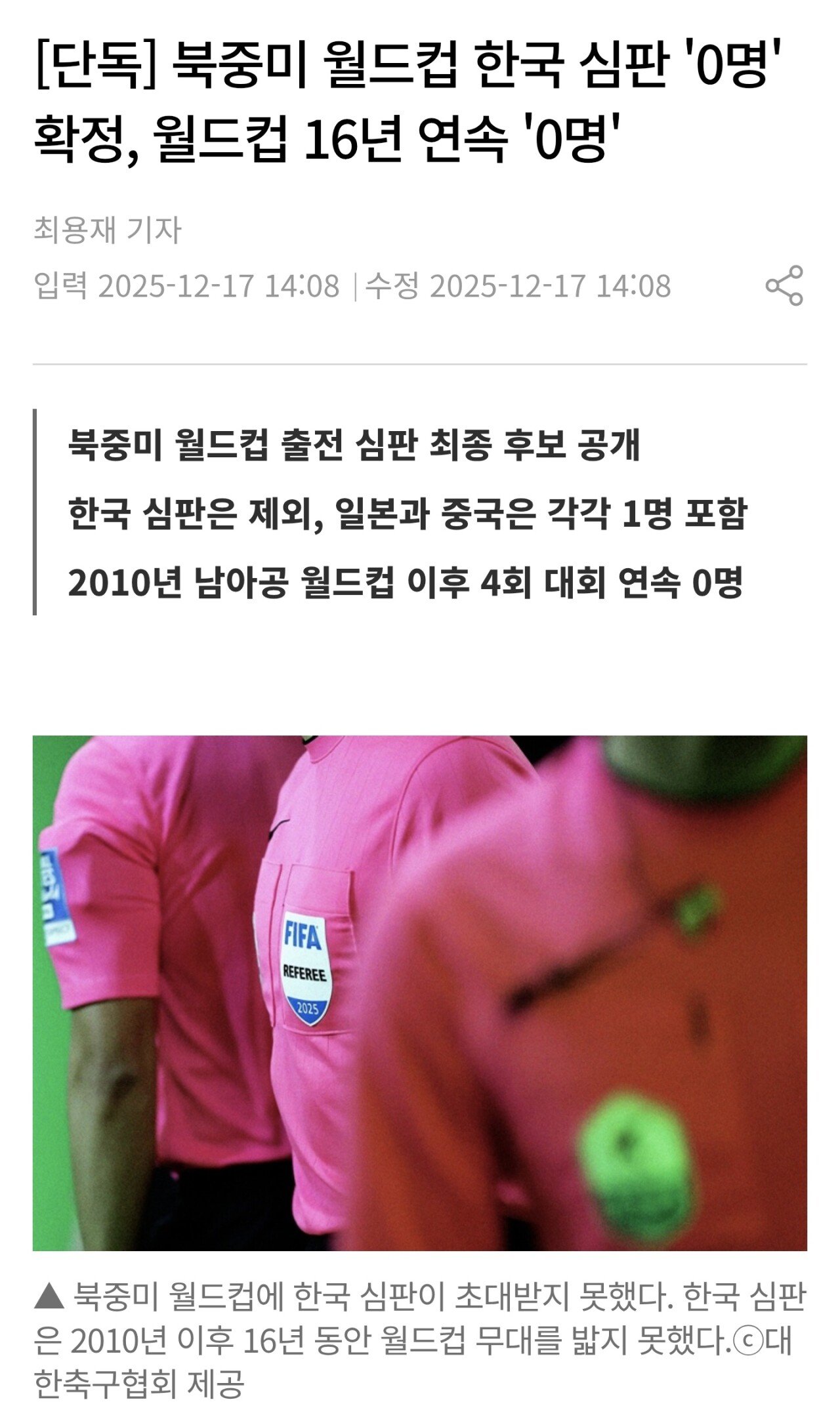 북중미 월드컵 한국 심판 0명 확정, 월드컵 16년 연속 0명