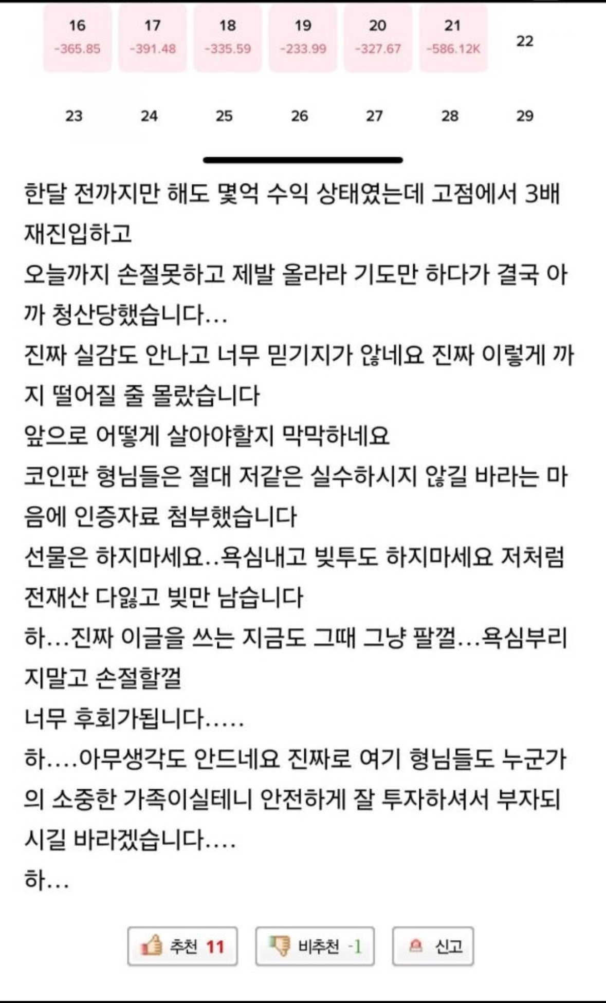 최근 코인 선물에서 청산 당하고 순자산 마이너스 전환