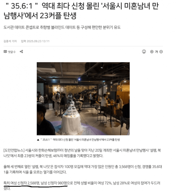 서울 미혼남녀 근황 ㄷㄷㄷ 작성자 정보 울아빠g80오너 작성 작성일 2025.09.28 22:13 컨텐츠 정보 60 조회 목록 본문 여자 2588명 / 남자 980명 ㄷㄷㄷㄷ 외로운 남자보다 외로운 여자가 더 많음 ㅋㅋㅋ 관련자료 이전 성대 의대가 연대 의대를 추월한 이유 작성일 2025.09.28 22:20 다음 부자는 망해도 3년간다는게 작성일 2025.09.28 21:59 댓글 0 등록된 댓글이 없습니다. 로그인한 회원만 댓글 등록이 가능합니다. 목록