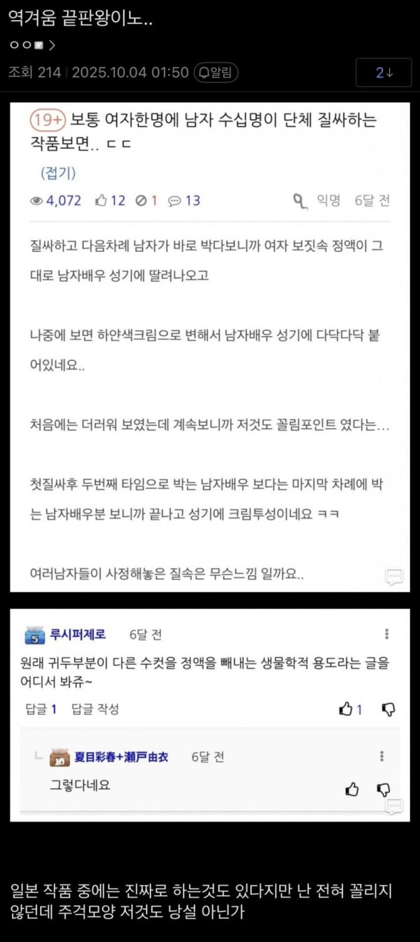 어딘가 잘못된 이상성욕 ㄷㄷ.. 작성자 정보 1029 작성 작성일 2025.11.02 23:38 컨텐츠 정보 96 조회 목록 본문 대부분 가짜인줄 알았는데 일본쪽은 찐으로 하는게 있나보네 ㅋㅋ 나도 역겨워서 싫던데 주걱모양은 뭐지 ㅋㅋ 관련자료 이전 짝녀가 답장을 9시간 뒤에 하는데 가능성 있죠? 작성일 2025.11.02 23:45 다음 100만원 버는 법..jpg 작성일 2025.11.02 23:26 댓글 0 등록된 댓글이 없습니다. 로그인한 회원만 댓글 등록이 가능합니다. 목록