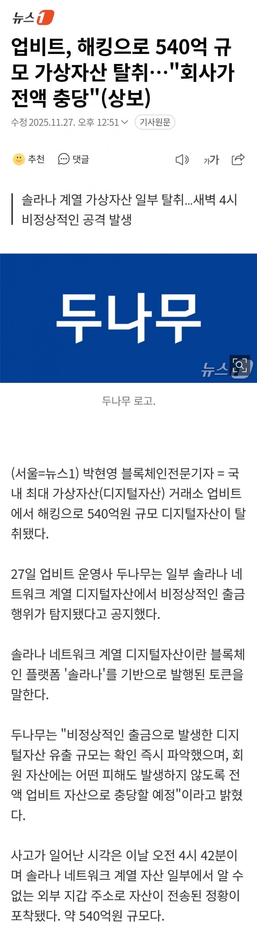 업비트에서 540억 해킹 발생