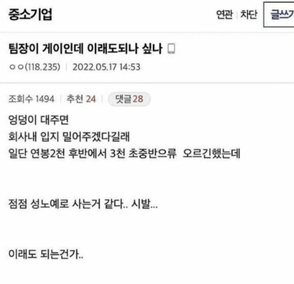 연봉올리는법 작성자 정보 앙기모띄 작성 작성일 2025.10.04 21:38 컨텐츠 정보 134 조회 목록 본문 좆소팀장이 그런 능력이 없음 조기 진급 시켜야하는데 명분이 있어야지 그리고 동료들 눈치도 있고 관련자료 이전 싱글벙글 생각보다 맛있는 음료 작성일 2025.10.04 21:45 다음 계곡 울놀이간 여자 작성일 2025.10.04 21:31 댓글 0 등록된 댓글이 없습니다. 로그인한 회원만 댓글 등록이 가능합니다. 목록