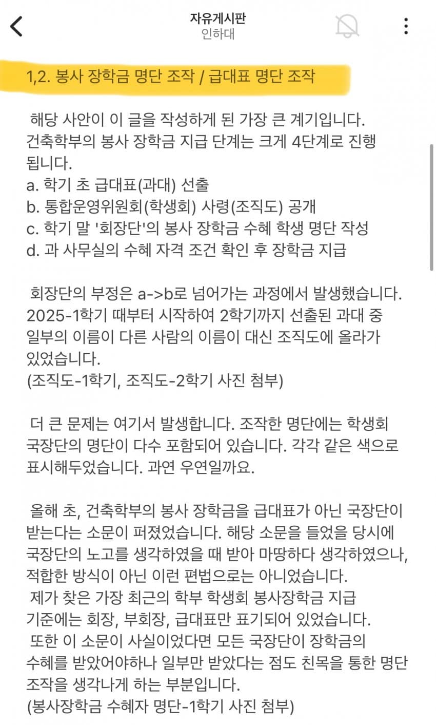 1. 봉사 장학금 선발 과정에서 실제 과대표가 아닌 사람들을 조직도명단에 올려 장학금을 받게 했다고 주장함
