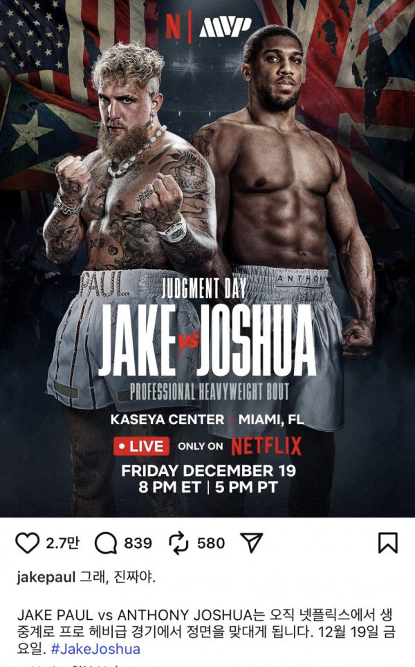오피셜) 제이크폴vs조슈아 12월19일 경기 확정
