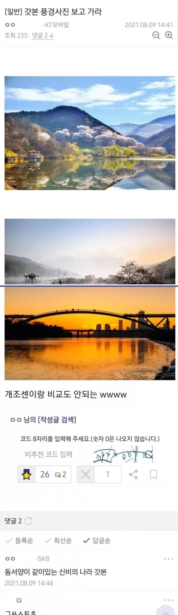 갓본 풍경사진 보고가라 작성자 정보 선풍기강풍 작성 작성일 2025.10.09 21:17 컨텐츠 정보 45 조회 0 추천 0 비추천 목록 본문 근데 이상하게 키워드에 일본이 들어가면 이상하게 풍경이 아름다워보임.. 0 추천 0 비추천 관련자료 이전 오싹오싹 주토피아 현실 작성일 2025.10.09 21:24 다음 지난달 발생한 안타까운 사고 작성일 2025.10.09 21:10 댓글 0 등록된 댓글이 없습니다. 로그인한 회원만 댓글 등록이 가능합니다. 목록