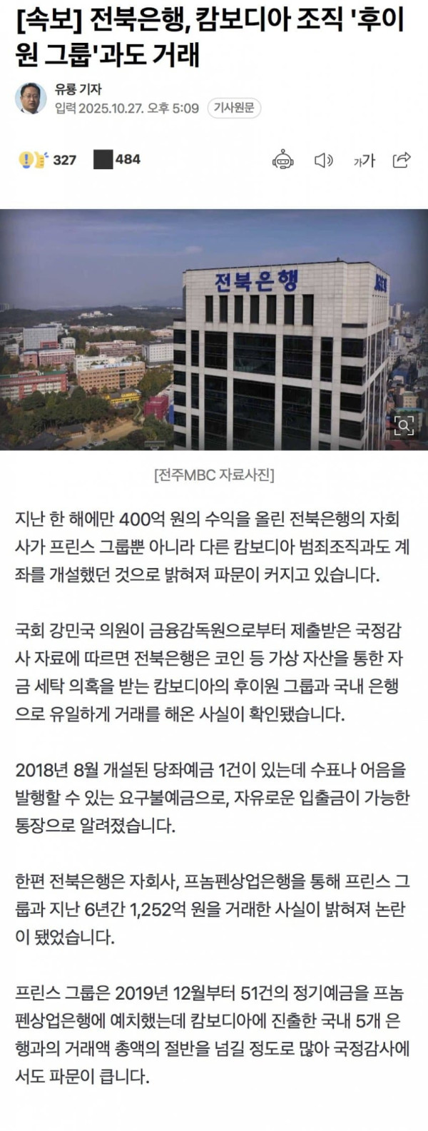 전북은행, 캄보디아 조직 '후이원 그룹'과 은밀히 거래해오다 적발