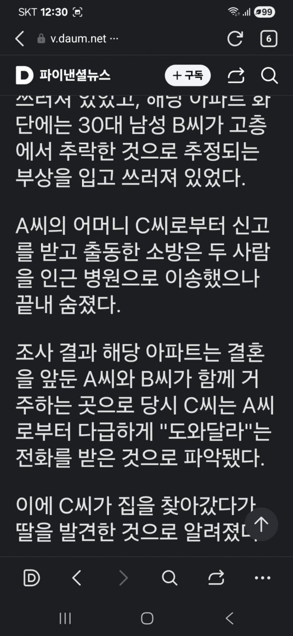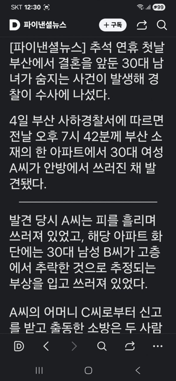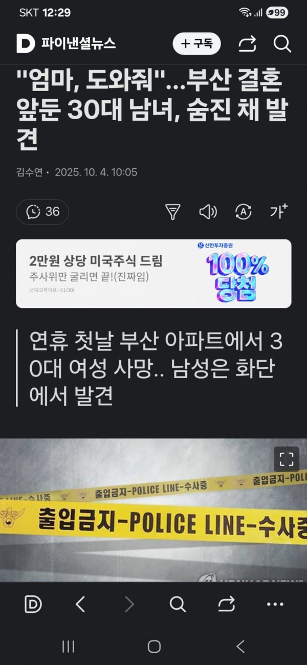 부산 30대 예비부부 숨진채 발견 작성자 정보 앙기모띄 작성 작성일 2025.10.08 21:48 컨텐츠 정보 42 조회 0 추천 0 비추천 목록 본문 진짜 안타깝다....고인의 명복을 빕니다 0 추천 0 비추천 관련자료 이전 서울 원룸 레전드 작성일 2025.10.08 21:55 다음 주식 이미지가 왜 씹창이긴... 작성일 2025.10.08 21:41 댓글 0 등록된 댓글이 없습니다. 로그인한 회원만 댓글 등록이 가능합니다. 목록