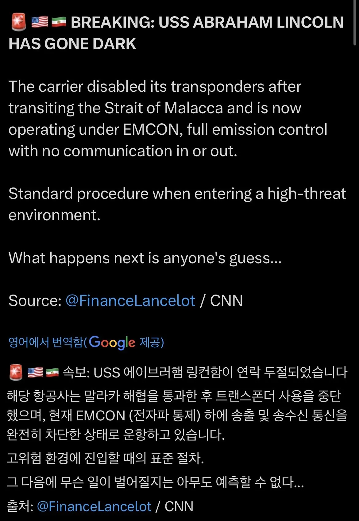 속보) 링컨함 위치 파악 불가