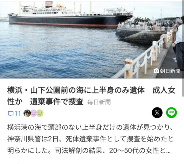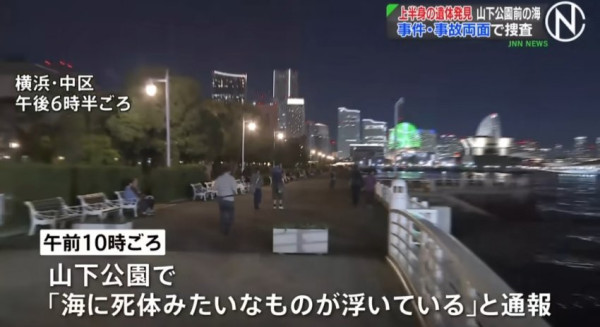 11월 1일 오전 10시경 요코하마시 나카구 야마시타 해안공원 바닷가에서 머리없이 상반신만 떠다니는 시신이 발견