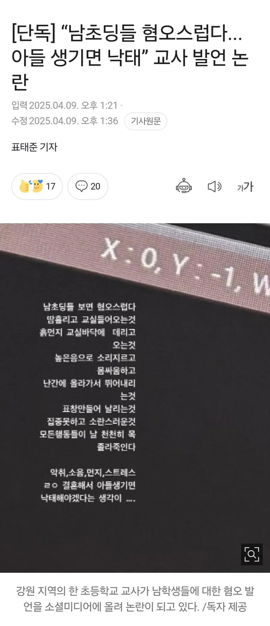 아들 생기면 낙태 한다는 여교사..