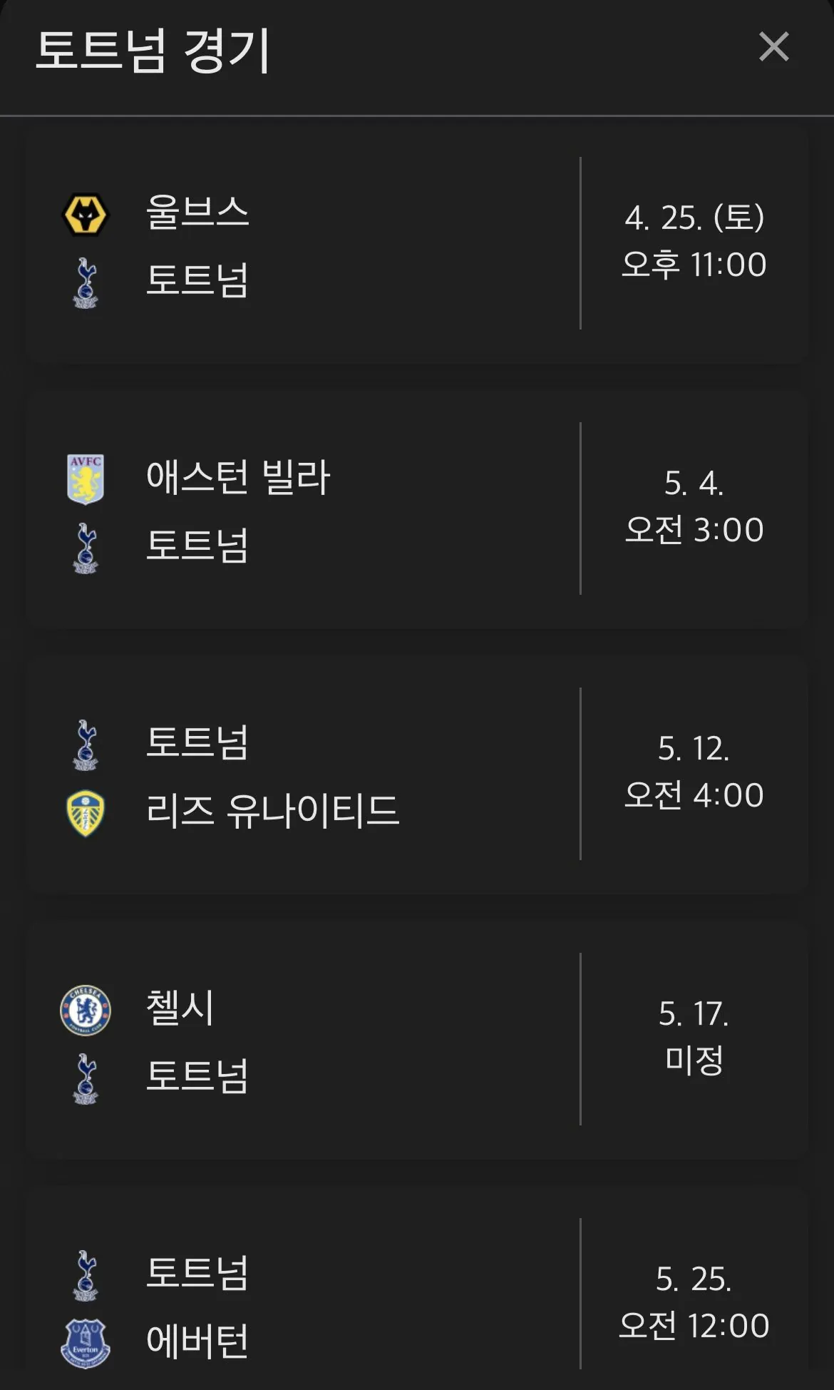토트넘 강등위기 남은 경기 일정