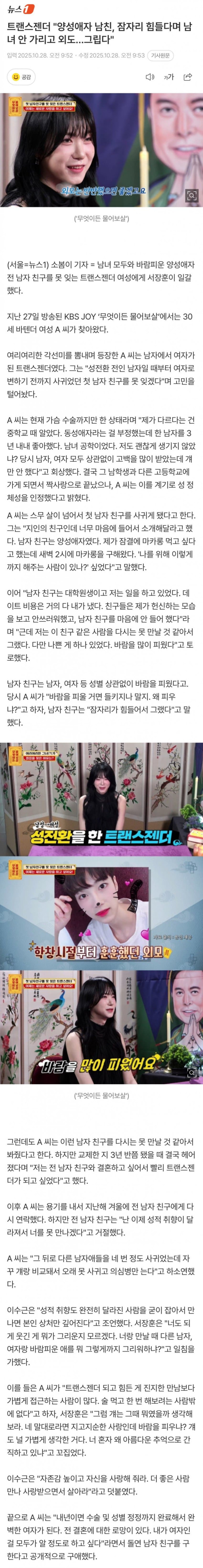 트랜스젠더 양성애자 남친, 잠자리 힘들다며 남녀 안 가리고 외도…그립다