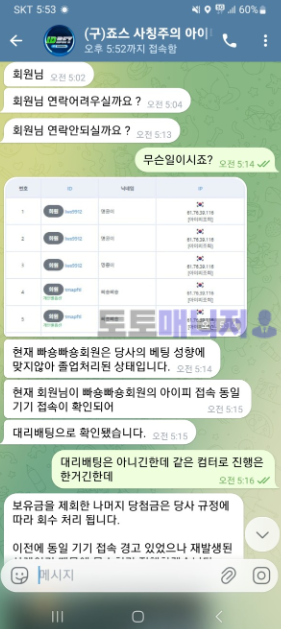 1. 10번 넘게 꼴 때는 방치, 본전 1,000만 원 찍자마자 \\'칼 제재\\' 이틀 동안 1,500만 원을 박으며 10회 넘게 충전금이 바닥날 때는 아무 말 없던 사이트입니다. 잃어줄 때는 VIP 대접하더니, 겨우 베팅이 풀려 본전 근처인 1,000만 원을 찍자마자 기다렸다는 듯이 텔레그램으로 연락이 왔습니다. 고액 충전 유저가 돈을 잃을 때는 방관하다가, 돈을 찾으려니 실시간 모니터링하며 \\'대리 배팅\\' 작업자로 몰아가는 아주 질 낮은 수법을 씁니다.