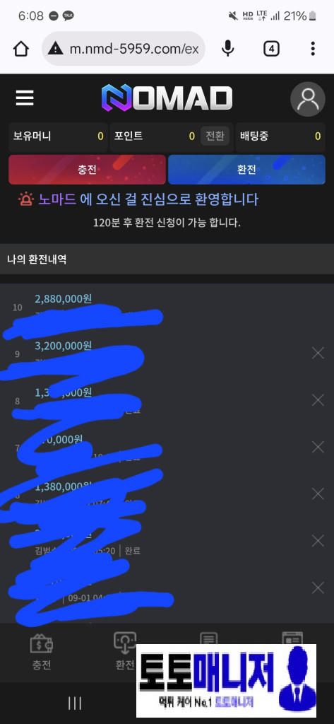 최근 온라인 베팅 플랫폼 ‘노마드(NOMAD)’ 이용 중 288만원 규모의 환전 거부 피해를 당했습니다.