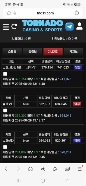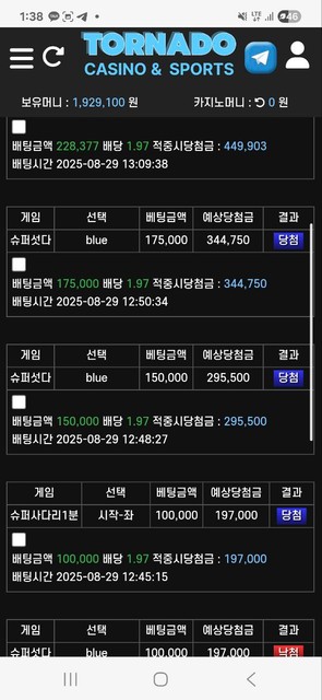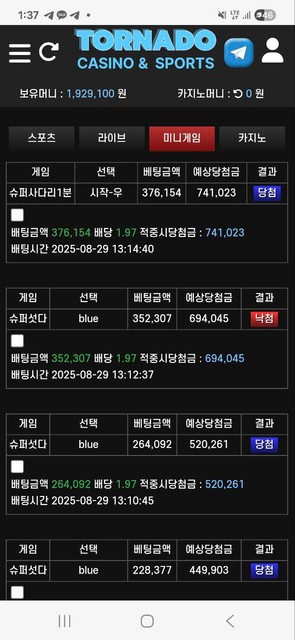토네이도(tnd11) 충전 후 배팅하다 192만 원까지 불렸는데, 사이트 오류로 쌓인 포인트라고 트집 잡더니 악성 배팅이라며 차액도 지급 안 하고 계정까지 차단했습니다. 전형적인 먹튀 사이트이니 절대 이용하지 마세요.