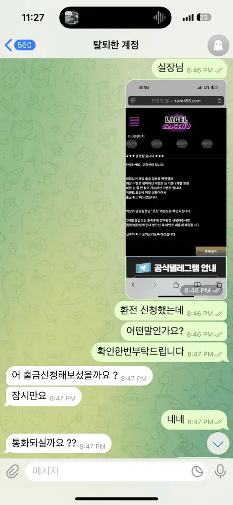 나는 ㅈㄴ 믿고 충전했는데 결국 환전은 개뿔, 계정 삭제시키고 텔레그램도 차단. 와 진짜 개빡친다… 사람 돈을 이렇게 대놓고 훔쳐먹고 도망가냐?
