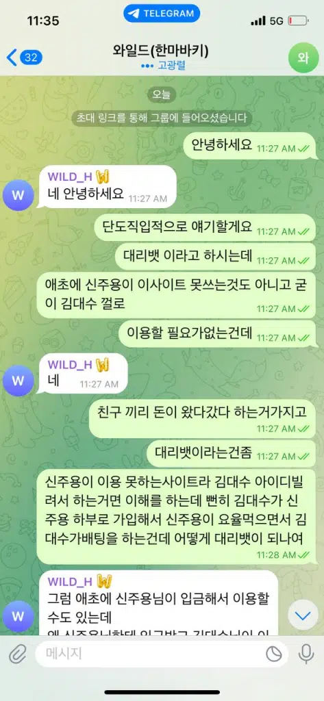 와일드홀덤 먹튀 당했습니다. 지인 소개로 400 충전해서 2800까지 만들었는데, 대리 배팅 운운하면서 환전 거부하더니 결국 저랑 지인까지 차단하고 계정 삭제 까지 당했네요