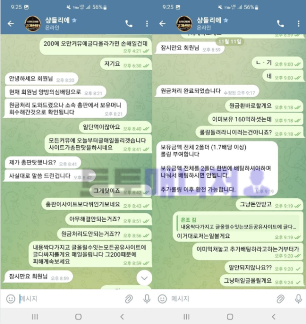 장점검핑계되면서 회원보유머니 다회수후 총판탓하면서 돈안내줍니다 환전버튼자체가없는곳이에요 일주일동안 준다준다 질질끌더만 텔밀고 잠수타네요 50충 215만 먹찍는 거지사이트입니다 요즘 돌발20프로 쪽지 매일보내던데 그거미끼로 먹다찍고다니니 조심하세요