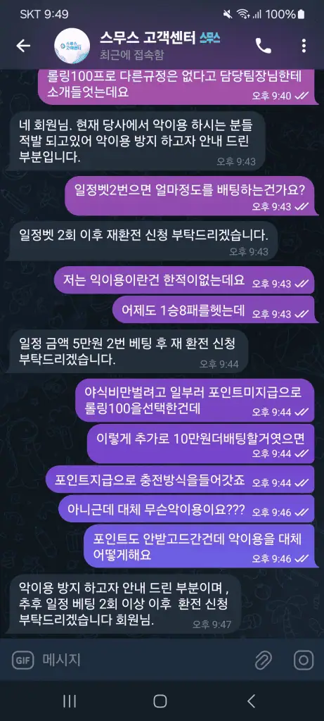 아니 “악이용”이 뭔데요? 근거도 없고, 규정도 없고, 그냥 지들 맘대로 단어 하나 던져놓고 이용자 돈 지들 마음대로 묶어버린 겁니다. 더 어이없는 건, 제가 시키는 대로 추가 롤링까지 다 맞췄는데도 환전 안 해줬다는 겁니다. 이쯤 되면 그냥 사기죠, 씨발.