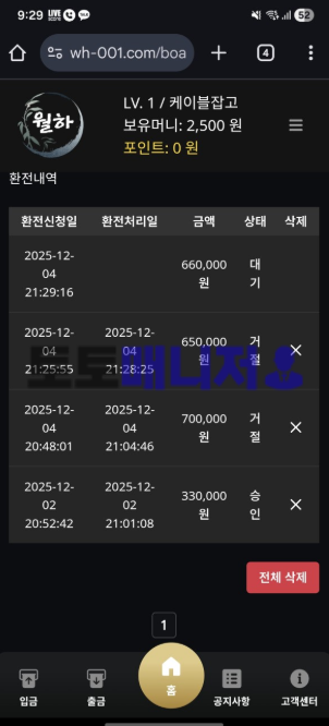 환전 70채울려고 하니깐 양방의심된다고 300%로 채우라네요?그래서 300%채우고 66만원 환전신청했더니 공지에 1000%로 채워야된다고 환전 신청이 거절됬습니다.그리고 탈퇴시키네요.
