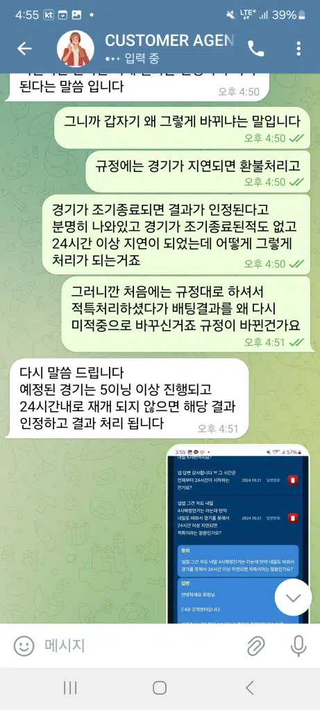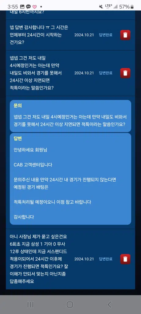 그런데 CAB 측은 약속을 지키지 않았습니다. 갑자기 “기권으로 경기 종료”라는 말도 안 되는 거짓 안내를 하더니, 제 배팅을 그냥 미당첨 처리해 버렸습니다. 당연히 환불은 없었고요.