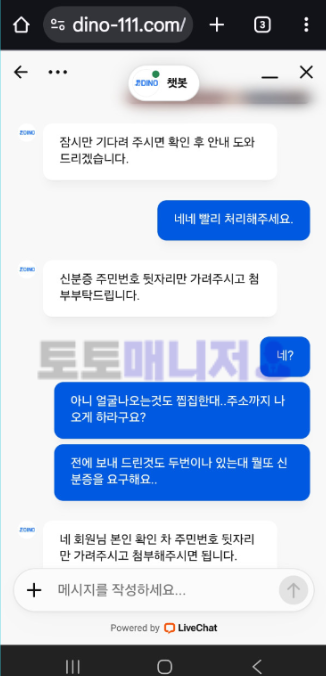 25년 11월 13일 저녁 9시 45분경  다이노 사이트 로그인  하려고하니 비번이 틀리다고 나와서 다이노에 문의. 다이노측 본인인증 확인후 로그인 도와준다고 민증 보내라고함..