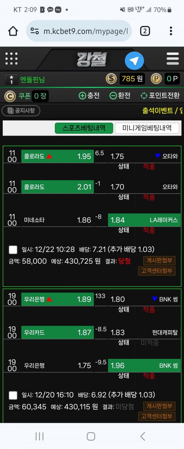 오늘 NHL 콜로라도 마핸오버 + NBA 레이커스 플핸 3폴더 당첨됐습니다.