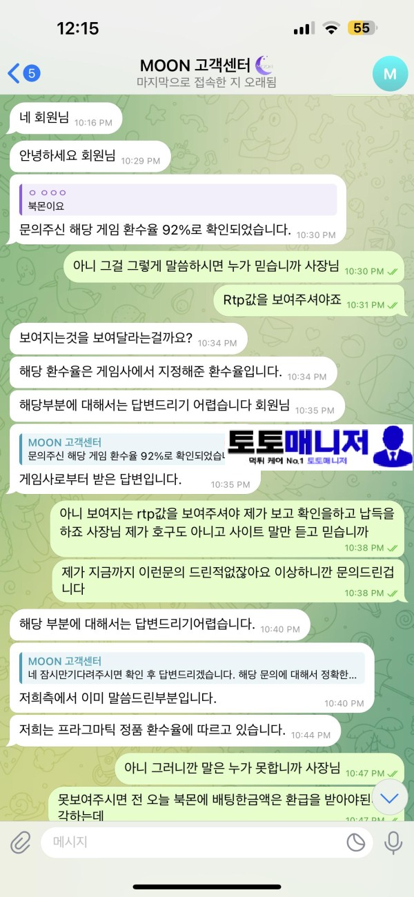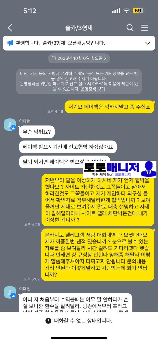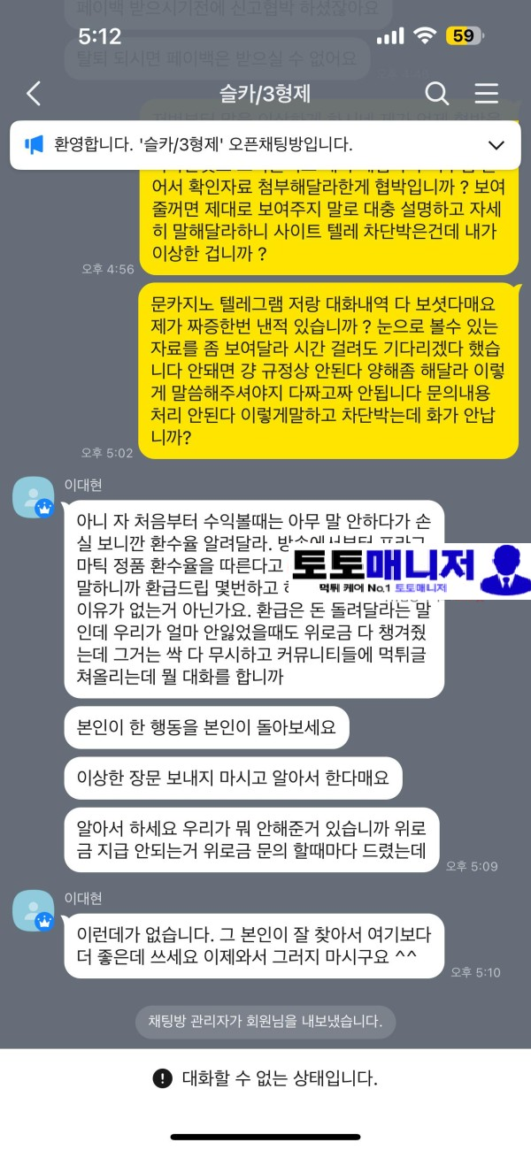 사진처럼 대답하고선 보증 제휴 쪽에서는 “환급 협박”이라며 사이트 짜르고, 텔레그램은 바로 차단.