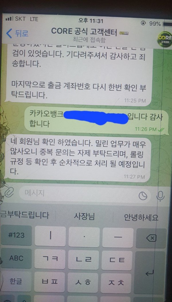 제가 새로운 텔레그램 계정으로 문의하면 답장 잘 오다가,