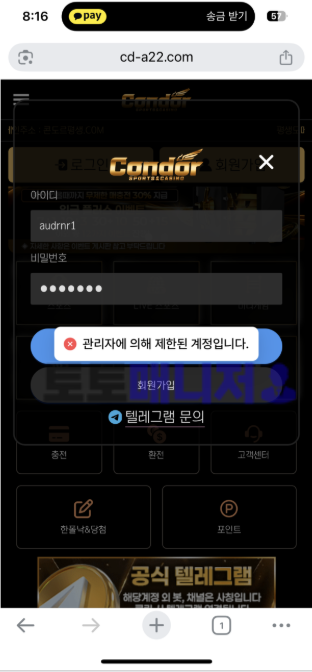 진짜 콘도르 이용하지 마세여 정말 쓰레기 업체 입니다 . 15충 53 환 다만 38충 전 내역 있습니다 .