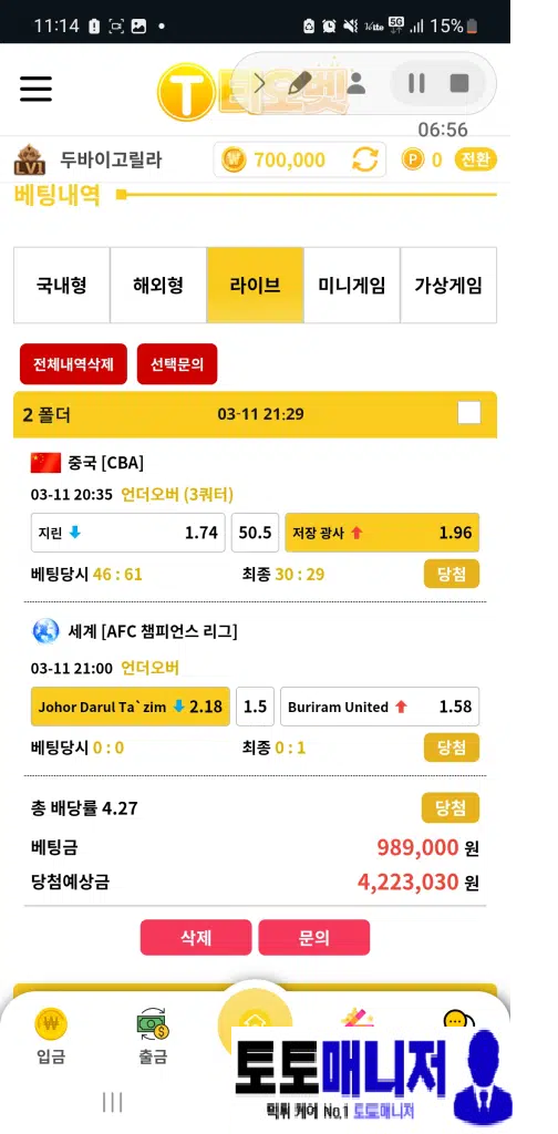 초기 86만언 입굼하고 특정 스포츠에 배팅해서 422만언으로 당첨까지 했는데