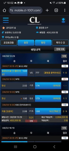 약 180만 원가량을 잃은 뒤, 오늘 208만 원 환전을 신청했으나 일방적으로 취소됨