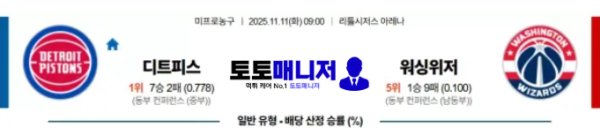 결론적으로, 공간 활용의 정교함과 리바운드 집중력에서 앞선 팀이 흐름을 지배합니다. 디트로이트는 코너 무브먼트의 디테일과 보드 장악력 모두에서 워싱턴보다 우위에 있으며, 후반에도 일정한 전환 속도를 유지할 수 있는 구조적 완성도를 보입니다. 따라서 이번 경기는 디트로이트 승리 쪽으로 기대값이 높습니다.