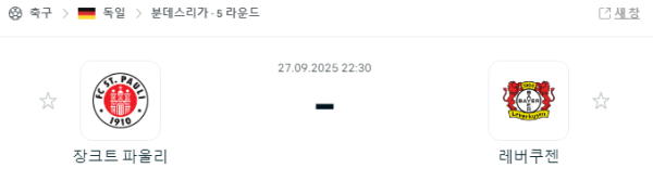 분데스리가 9월 27일 장크트파울리 레버쿠젠 맞대결 라이브