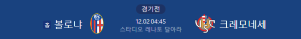 | 주요 매치업 | 볼로냐는 크레모네세의 밀집 수비를 뚫고 선제골을 넣는 것이 중요합니다. 크레모네세는 수비에서 버티면서 볼로냐의 공격 실수를 유도해 역습으로 득점을 노릴 것입니다. |