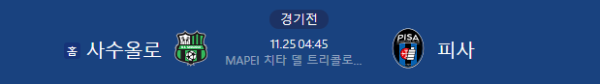 | 주요 매치업 | 사수올로의 창의적인 미드필드진이 피사의 수비벽을 어떻게 뚫어내느냐가 핵심입니다. 피사는 역습을 통해 사수올로의 수비 뒷공간을 노려야 합니다. |