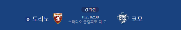 | 상대 전적 (최근 맞대결) | 양 팀의 최근 맞대결은 코모가 하부 리그에 있었기 때문에 공식 리그 경기보다는 친선전 기록이 대부분일 것입니다. 토리노가 전력상 우위입니다. |