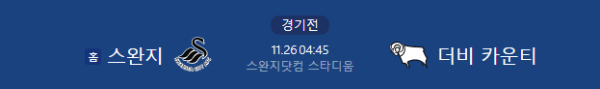 | 주요 매치업 | 스완지의 공격적인 풀백들과 미드필더들이 더비의 중앙 밀집 수비를 어떻게 뚫어내느냐가 핵심입니다. 더비는 스완지의 볼을 끊어낸 후 빠른 전방 침투를 노려야 합니다. |