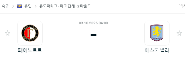 10월 3일 유로파리그 페예노르트 vs 아스톤 빌라 생중계