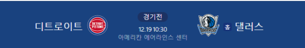 | 승패 | **디트로이트 승** | 동부 1위와 서부 하위권의 대결이며, 댈러스의 부상 이탈자가 너무 많습니다. |