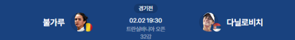 랭킹과 경험, 기술적 완성도 모든 면에서 **다닐로비치**가 앞서 있습니다. 불가루가 홈 응원에 힘입어 초반 저항하겠지만, 다닐로비치의 강력한 서브와 스트로크를 버티기엔 역부족일 것으로 보입니다. 예상 스코어는 세트 스코어 0-2 (다닐로비치 승)입니다.