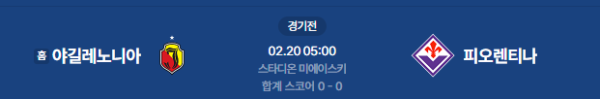 2026년 2월 20일 (금) 05:00 (KST) 예정 | UEFA 유로파 컨퍼런스리그(UECL) 16강 플레이오프 1차전 야길레노니아 비아위스토크 vs ACF 피오렌티나 분석