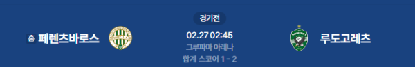 2026년 2월 27일 (금) 02:45 (KST) 예정 | UEFA 유로파리그 16강 플레이오프 2차전 페렌츠바로스 vs 루도고레츠 분석
