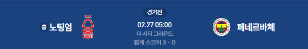 2026년 2월 27일 (금) 05:00 (KST) 예정 | UEFA 유로파리그 16강 플레이오프 2차전 노팅엄 포레스트 vs 페네르바체 분석