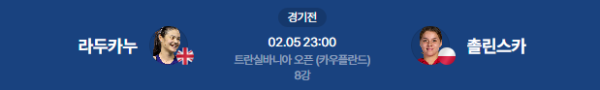 라두카누가 코너 구석구석을 찌르는 강력한 샷으로 경기를 지배하려 할 것이며, 촐린스카는 특유의 영리한 코트 커버와 기술적인 샷으로 라두카누의 템포를 뺏으려 할 것입니다. 라두카누가 유반전처럼 초반 집중력 난조만 보이지 않는다면 무난한 승부가 될 전망입니다.