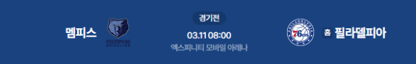 2026년 3월 11일(수) 09:00 (KST) 예정 | NBA 정규시즌 멤피스 그리즐리스 vs 필라델피아 세븐티식서스 분석