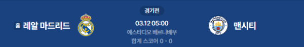 2026년 3월 12일(목) 05:00 (KST) 예정 | UEFA 챔피언스리그 16강 1차전 레알 마드리드 vs 맨체스터 시티 분석