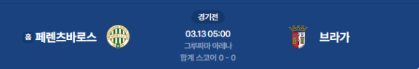 2026년 3월 13일(금) 05:00 (KST) 예정 | UEFA 유로파리그 16강 1차전 페렌츠바로스 vs 브라가 분석