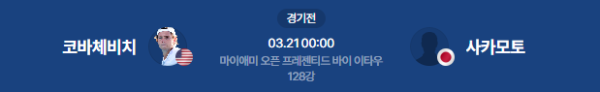 2026년 3월 19일(목) 21:00 (KST) 예정 | ATP 마이애미 오픈 1회전 알렉산더 코바체비치 vs 사카모토 레이 분석