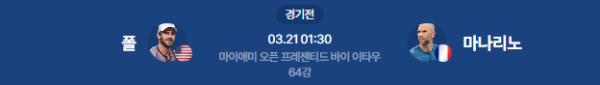 - 체력 변수: 최근 피트니스 이슈가 있는 폴이 마나리노의 끈질긴 랠리를 얼마나 버텨낼지가 관건입니다.